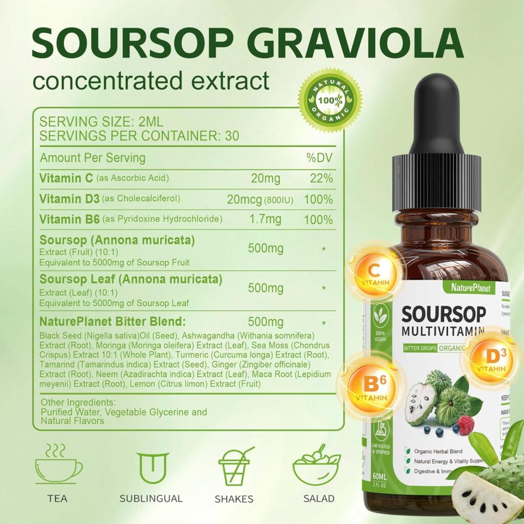 Easy to absorb and eat: Compared with soursop leaves tea and soursop extract capsules, our soursop liquid drops are convenient to eat, delicious, no need to soak in hot water or swallow the unpleasant capsules and can be added to mix with other foods edible.